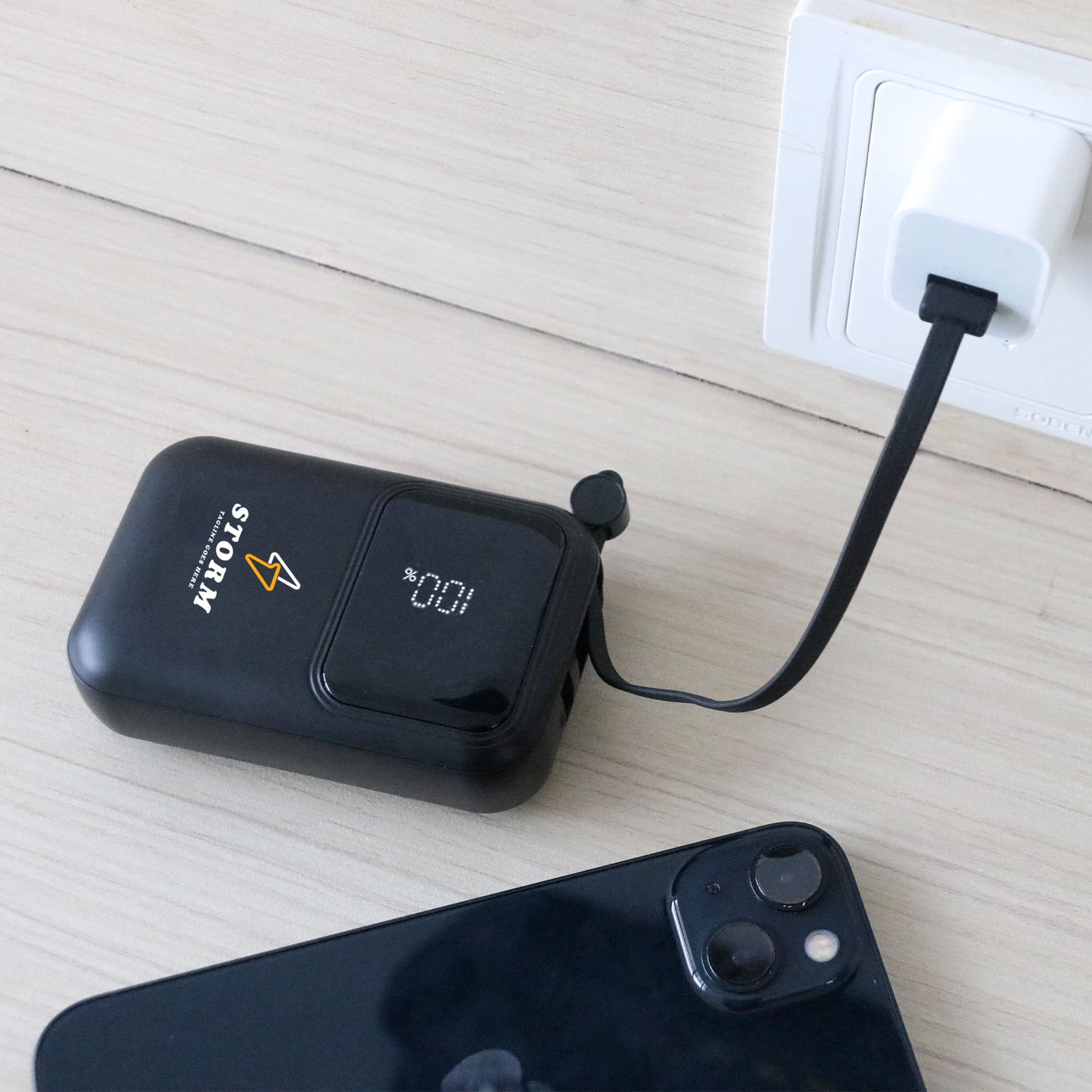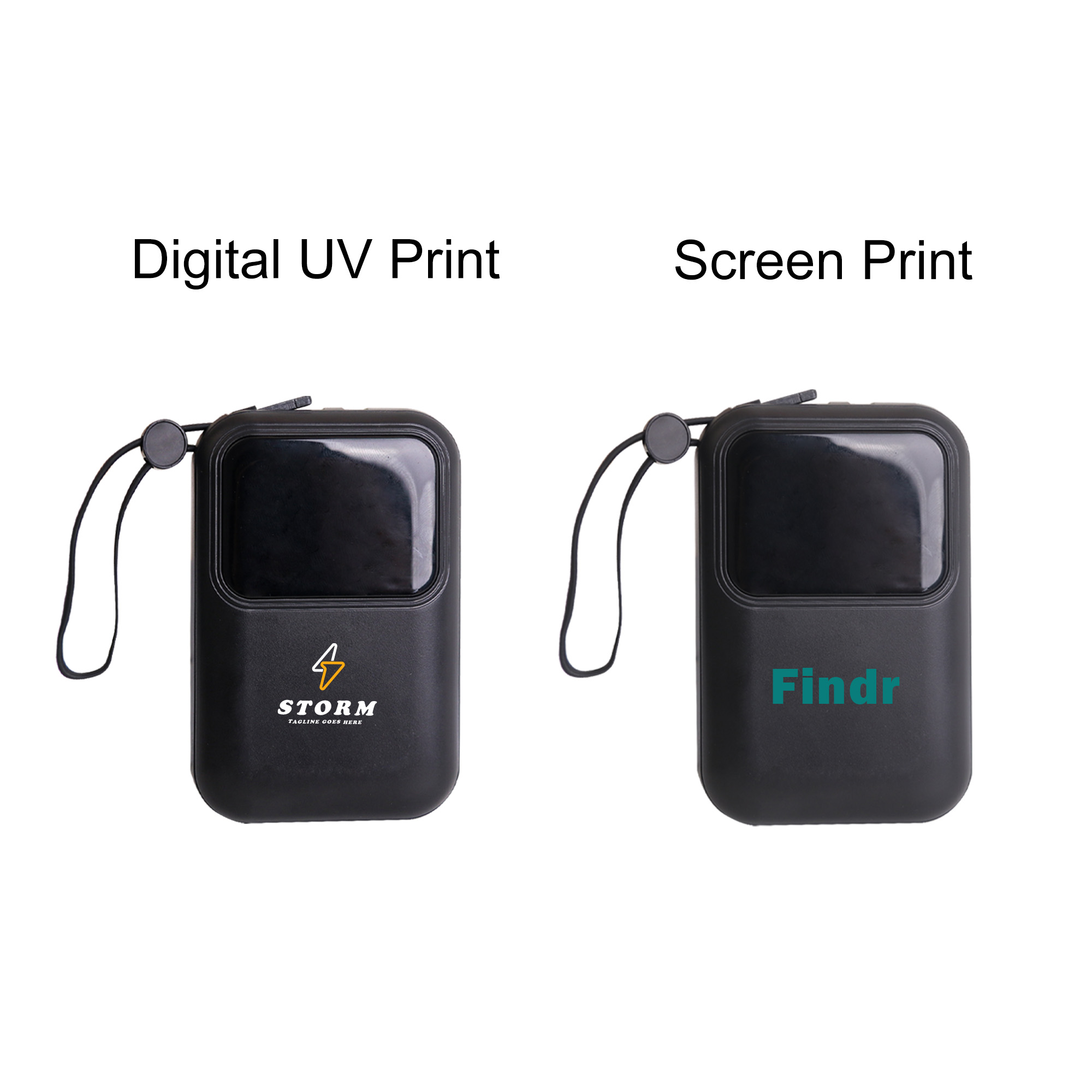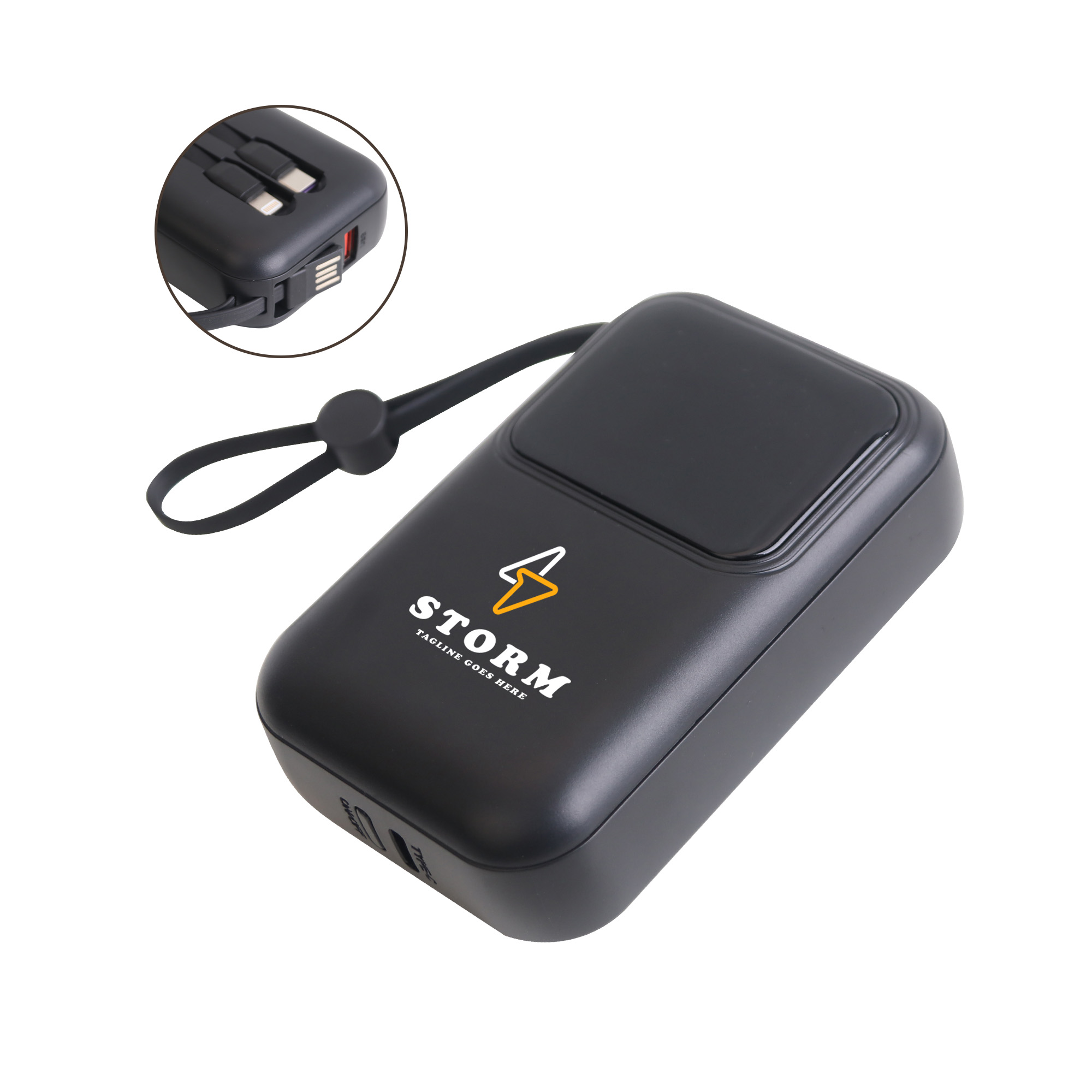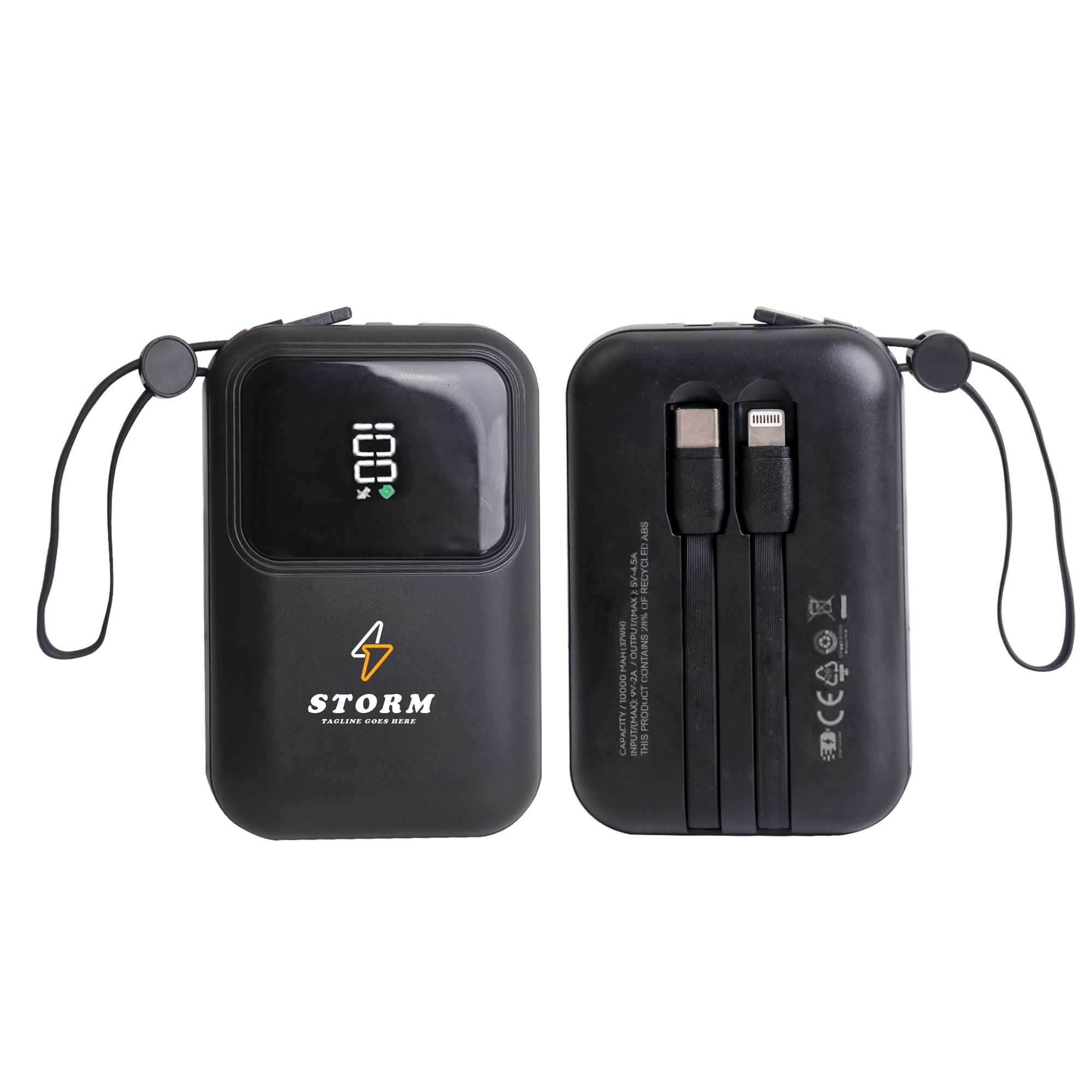 Keep your devices charged on the go, with our 10,000 mAH Eco Portable Fast Charging Power Bank. This power bank is small and portable, and comes with its own charging cables, USB Type C and Lightning, so you can charge on the go. We will use screen printing, UV printing to customize your brand logo. This product is made from 28% recycled ABS materials. Charging times: iPhone 15pro: about 2 times, Samsung S24: about 1.2 times.