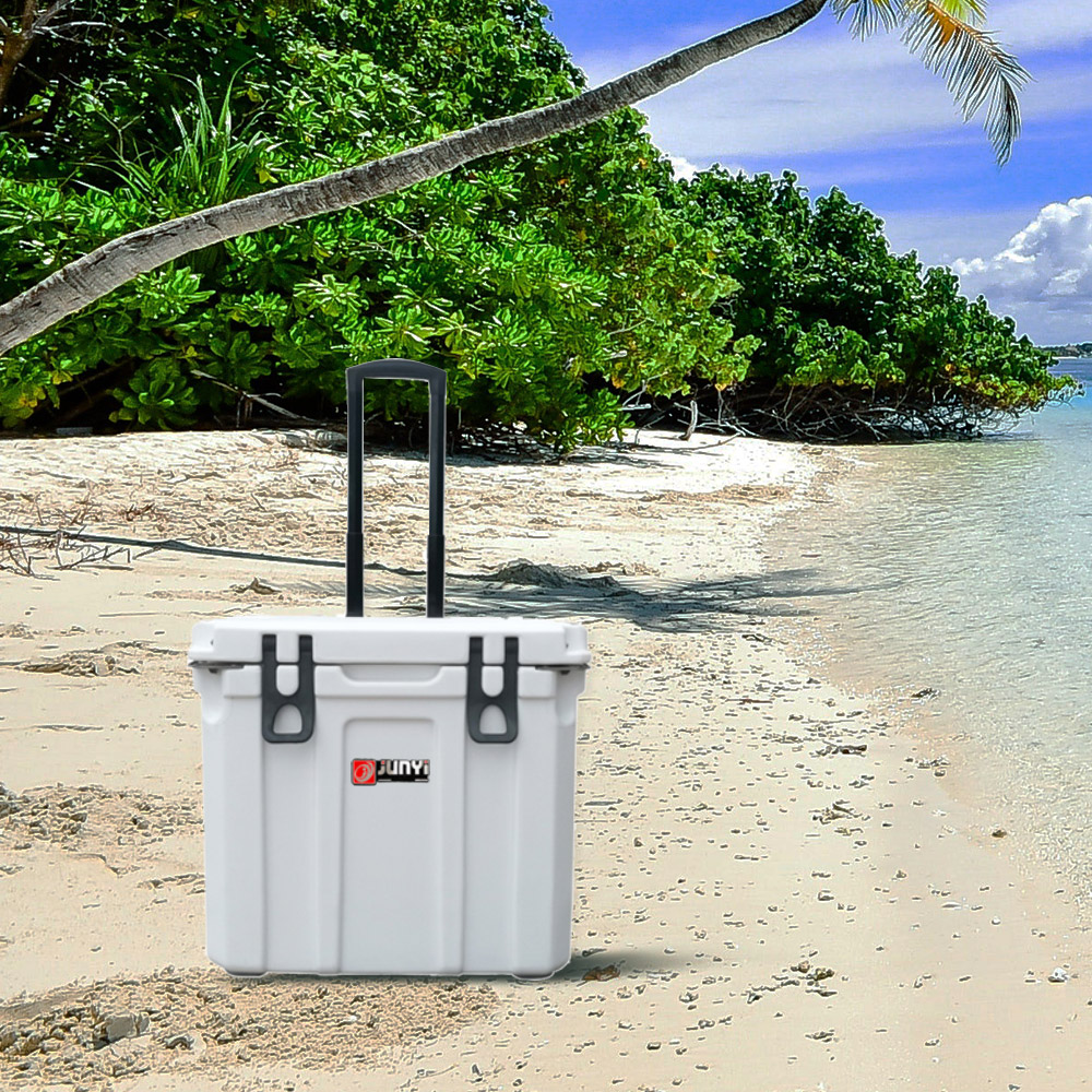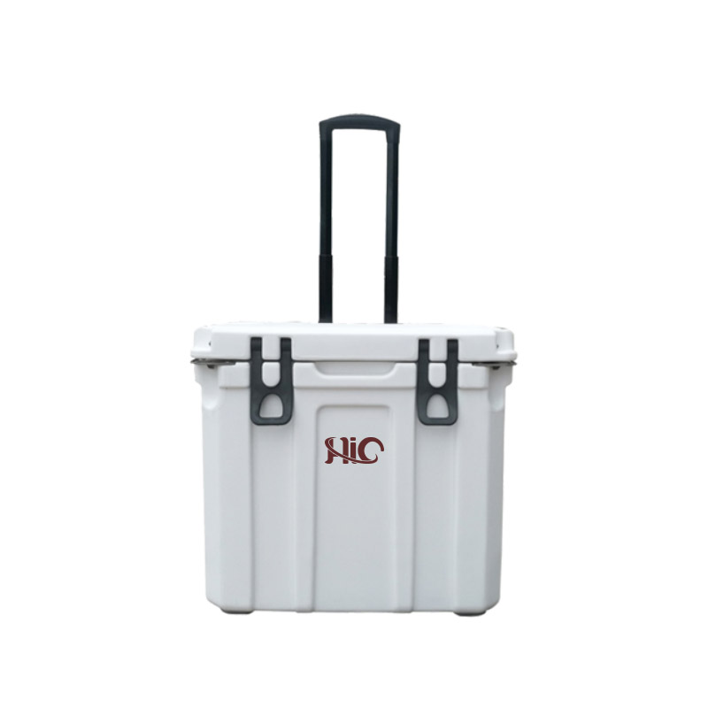 Keep your drinks chilled, and your branding seen with our great new 31L Cooler Box with Wheels! Made of quality PE and PU material, these coolers are not only durable, but come with superior insulation, to keep your drinks chilled for days on end. Ice cubes stay chilled for up to 3 days. Comes with attached bottle opener, and cup holders in the lid, for convenient use on the go. The extending handle and wheels make it easy to transport, you can roll it to anywhere you like. This is the ultimate high quality cooler for the summer.