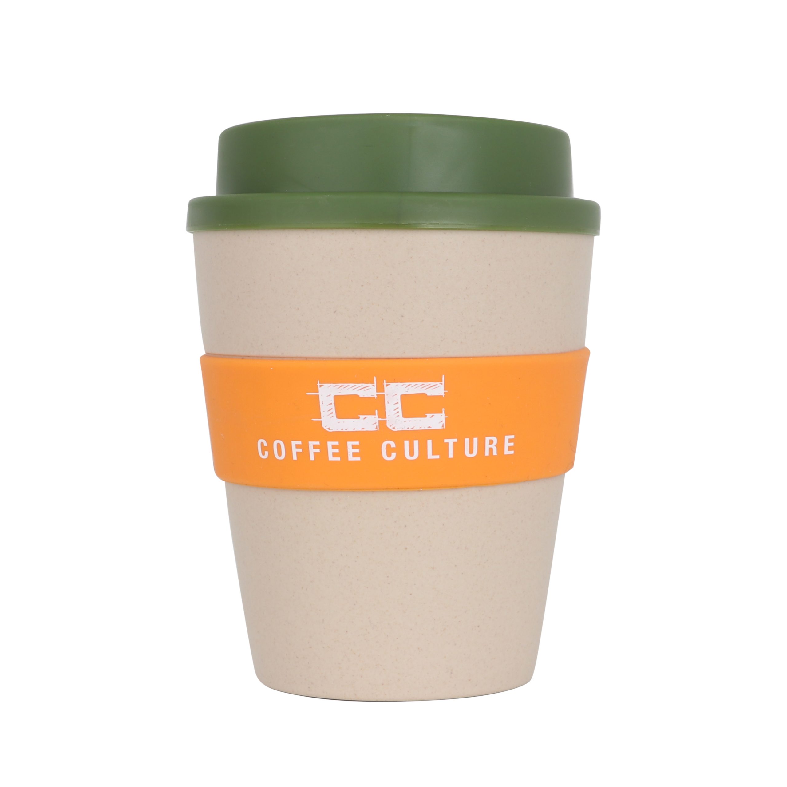 Natural rice husk fibre coffee cup with a secure screw on lid and a heat resistant silicone band. It is manufactured from natural rice husk fibre . It is a waste product with little value and the agricultural industry often dispose of it by burning which creates air pollution. Using it to make a reusable coffee cup reduces the amount of plastic, accelerates its biodegradability and produces a trendy natural look.