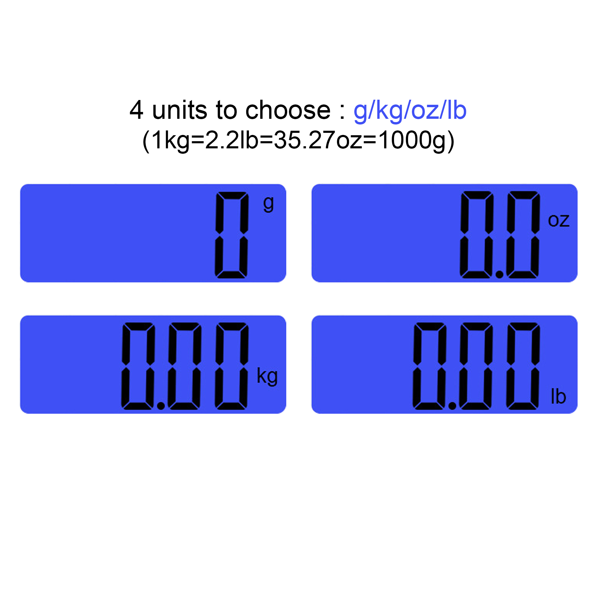 • 4 weight units (kg/g/lb/oz) can be switched at the touch of a button