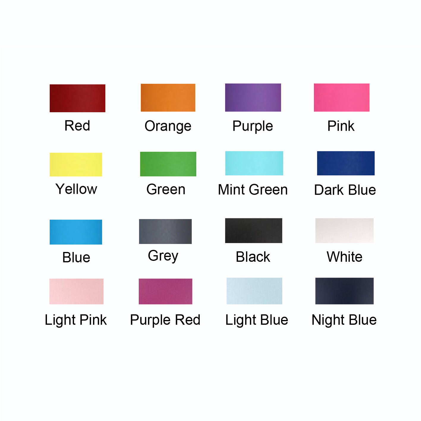 Black, Blue, Cyan, Dark blue, Dark grey, Deep red, Green, Lake blue, Orange, Pink, Purple, Rose red, Royal blue, Violet, White, Yellow