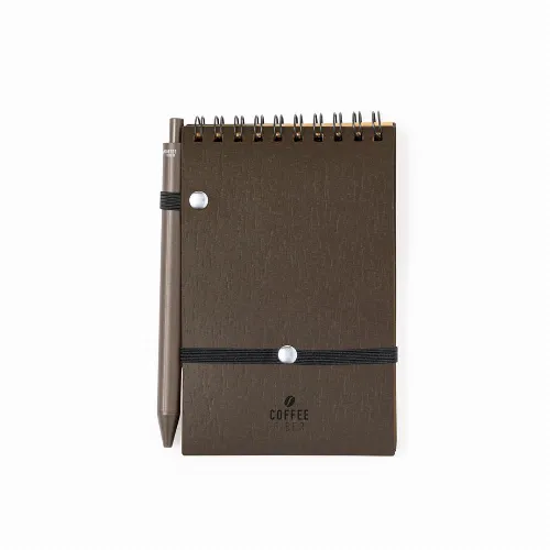 Notebook with double ring binder, soft covers, elastic band closure and ball pen holder. With 70 pages of single-stripe layout. Push-button mechanism ball pen with blue ink. Including coffee fibre logo, printed on both notebook and ball pen. Presented in an individual recycled bag.The coffee fiber is made from the waste generated in the production of coffee. A sustainable alternative that favors the reduction of plastic use, saving energy in the manufacturing process and thus promoting the care of the environment.