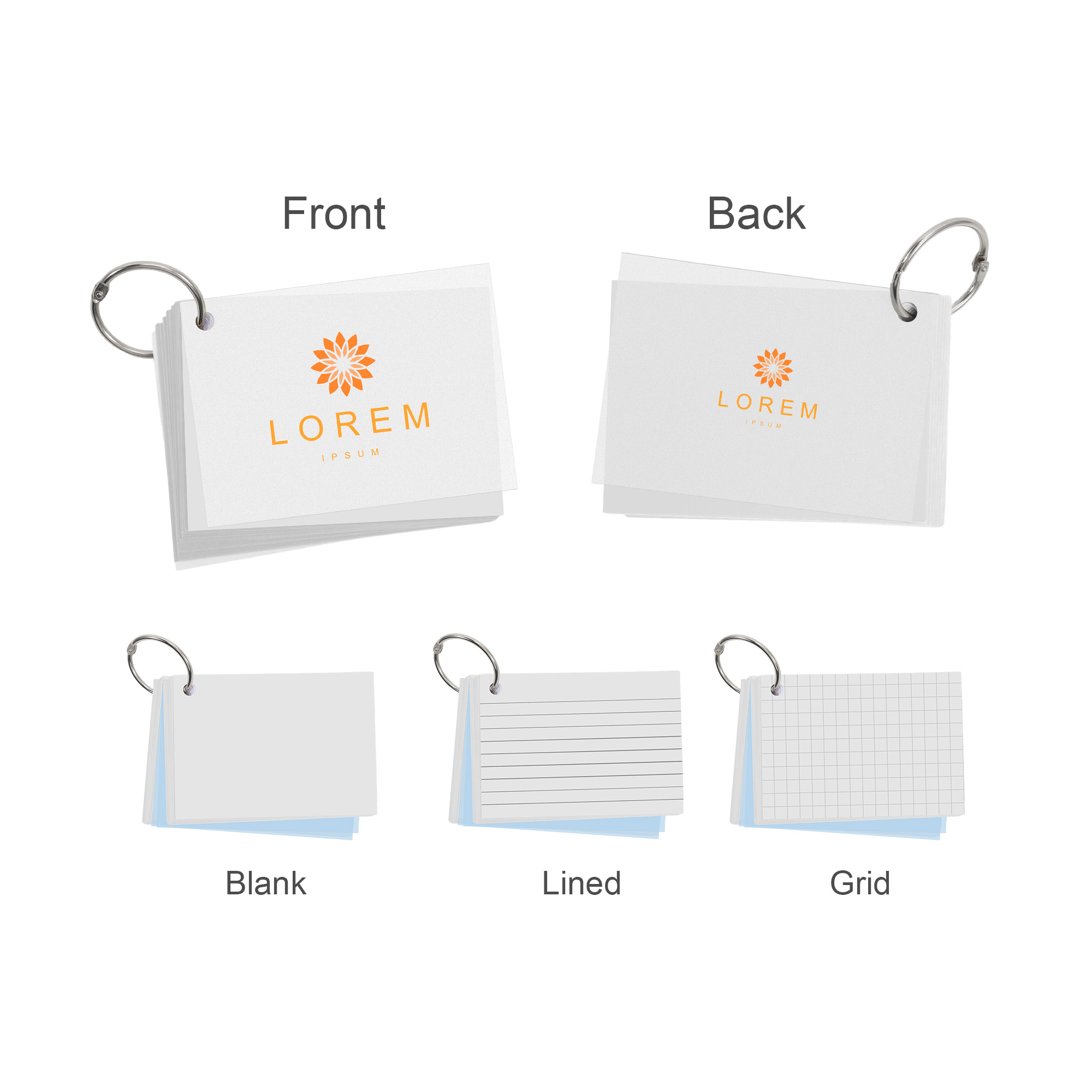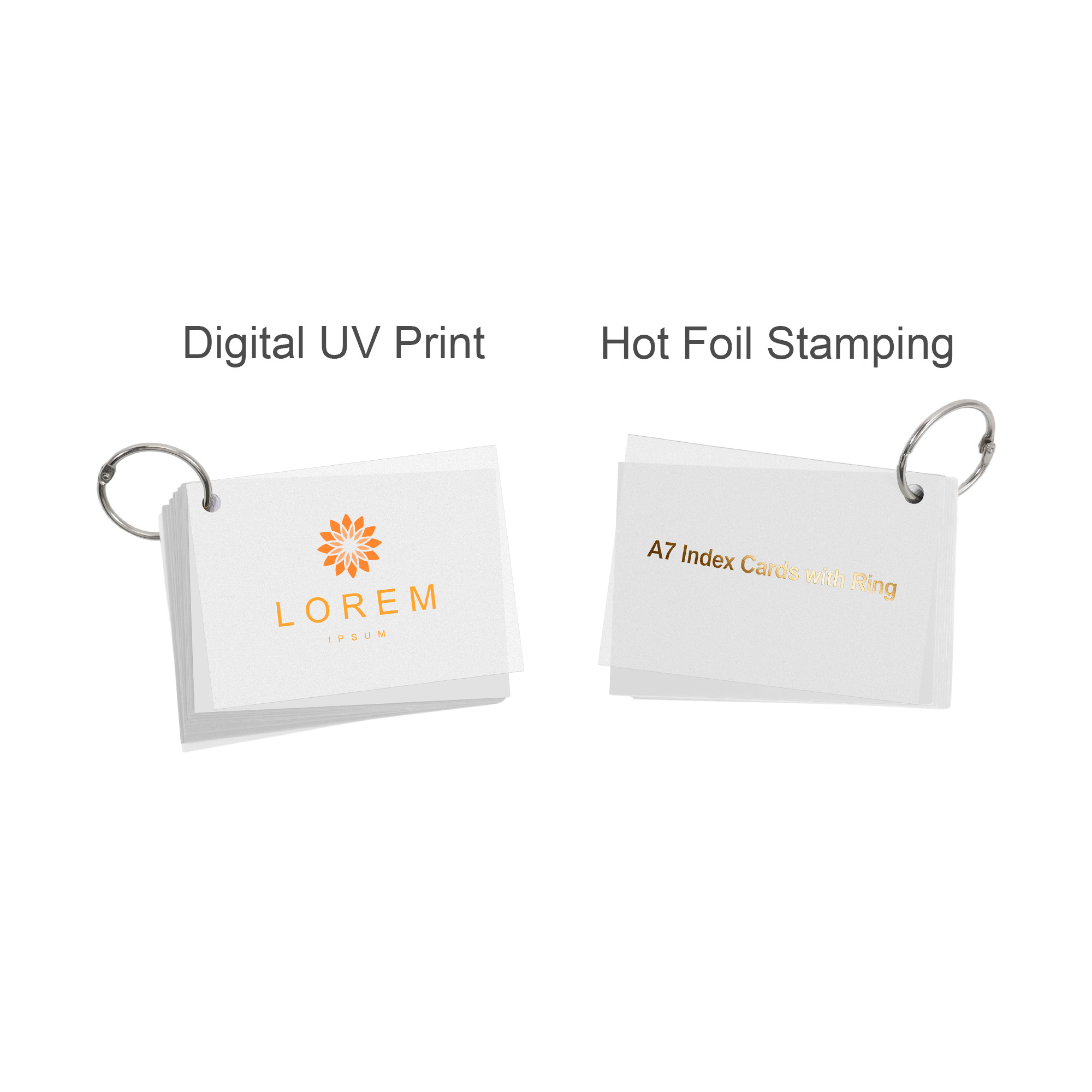 Organise your notes with our A7 PP Cover Index Cards with Ring, including 50 sheets. Featuring a durable PP cover and 100gsm paper inner sheets, our index cards are available in blank, lined, or grid styles. Personalise the cover with your logos or patterns through Digital UV printing or Hot foil stamping. Additional customisations include custom inner sheets with pantone matching or full colour printed patterns. Suited for study notes, office use, or promotional gifts, our index cards provide a practical way to promote your brand.