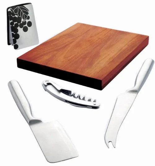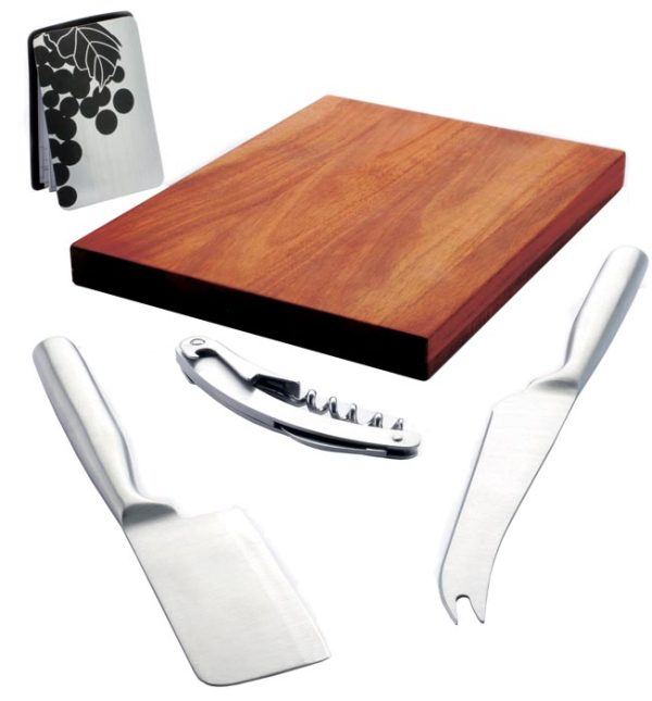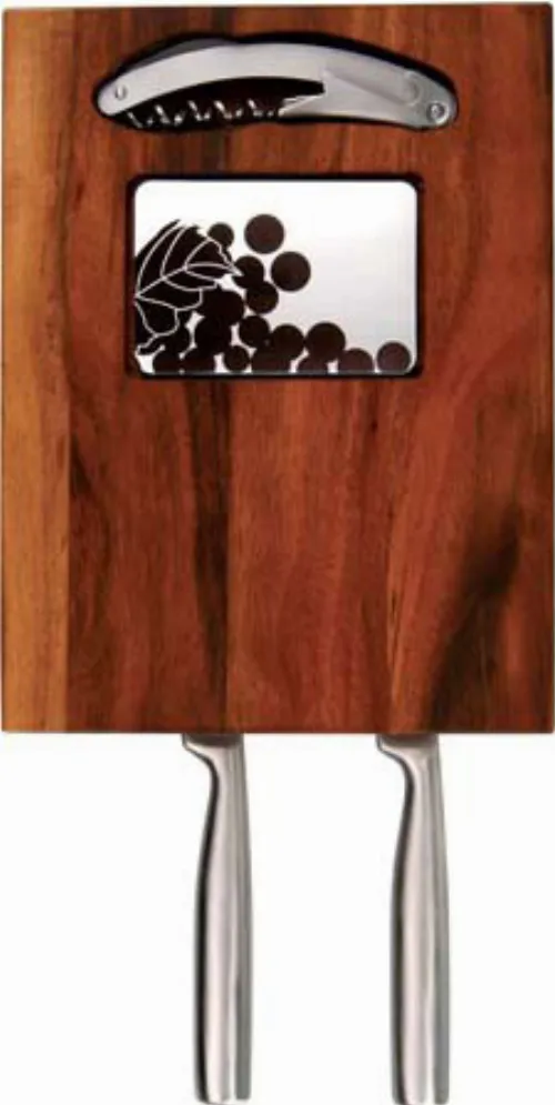 Wooden cheese board with two integrated cheese knives and corkscrew