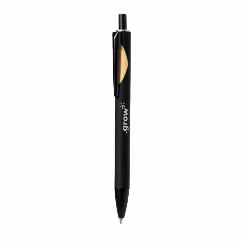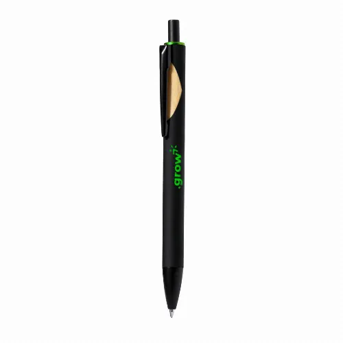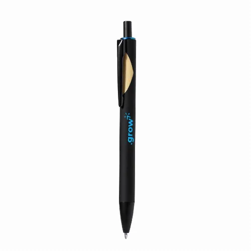 Solid black barrel and top fitting in varied colores. Especially designed for laser engraving, including a special coating for your logo to be properly engraved in matching color. In blue ink and presented in an individual recycled bag.Materials such as bamboo promote the use of natural raw materials, thus reducing pollutant emissions. It comes from a highly resistant and versatile plant, with rapid growth and regeneration, making it an excellent alternative to the use of traditional wood.
