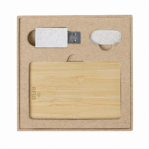 Including a RFID protected card made of bamboo, a webcam cover made of wheat straw and a data blocker made of wheat straw, preventing data transfer and allowing the device to be charged. Presented in an elegant box with die-cut compartments for each accessory.Materials such as bamboo encourage the use of natural raw materials, reducing pollutant emissions. It comes from a highly resistant and versatile plant with rapid growth and regeneration, making of it an excellent alternative to traditional wood.