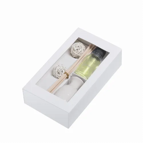Includes ceramic fragrance jar, aromatic sticks and 15ml glass jar with fragrance. Presented in an individual box with separate compartments and window.