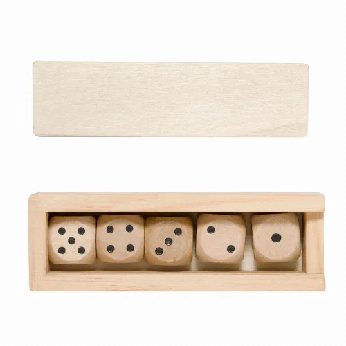 Including five dices with six sides each. Presented in a wooden case with a sliding lid.