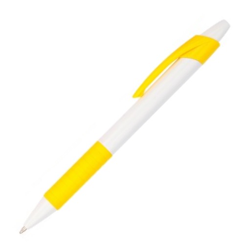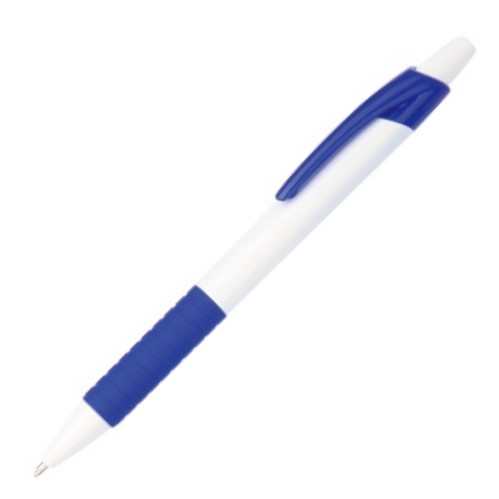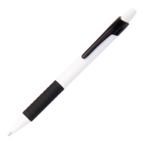 Solid white barrel, push button and tip, solid colored clip and rubber finished grip, 1.0mm slim refill