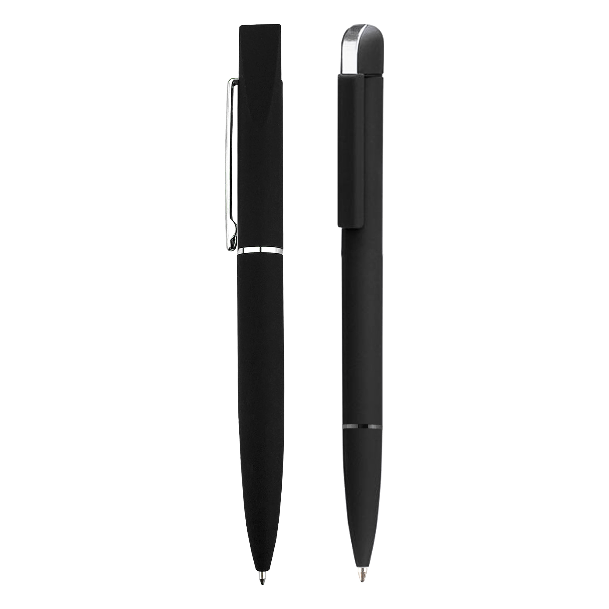 Our modern Axel metal pen and stainless-steel Crown metal pen. This due offer that rubberized finishing and with rubberized finishing twist action upper barrel with chrome mirror finishing on stainless steel pieces. With the Parker-Type Geran manufactured black ink that is 1800 metres, and 1500 metres. This due is functional and tech-savvy. All encompassed in a black cardboard gift box with a foam insert.