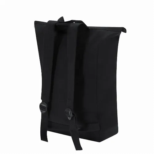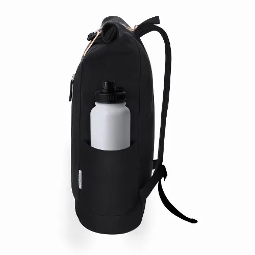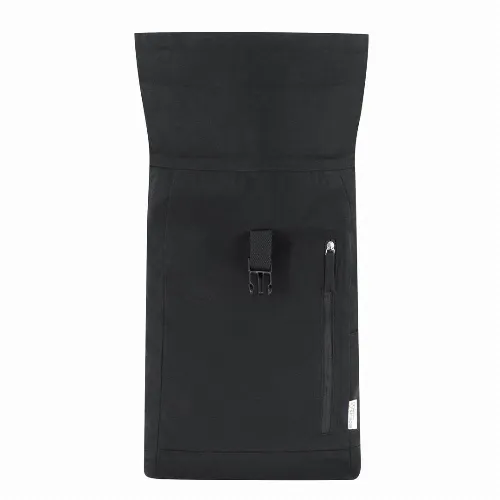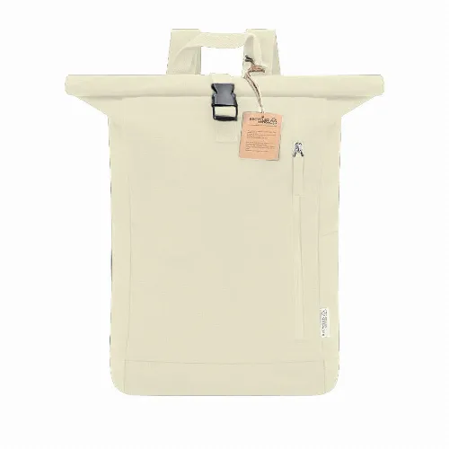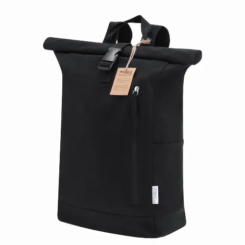 High capacity main compartment. with security buckle and velcro closure, plus a front pocket with invisible zip closure. Quick access pocket on the side and top handle, adjustable shoulder straps, and outside label with Recycled Cotton logo.