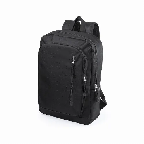 Resistant 600D polyester backpack with zipper closure and front pockets.