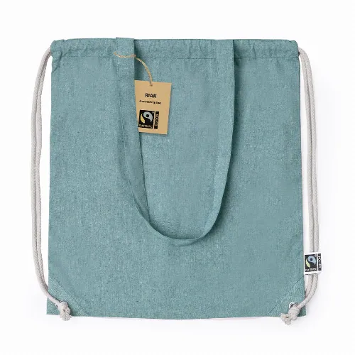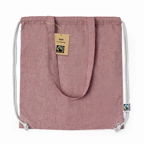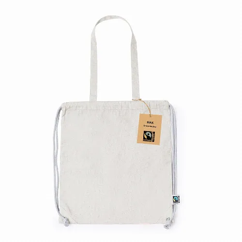 Stitched finish, with natural colour cotton strings and reinforced with metal eyelets. Including carry handles. and available in a variety of colors. Recycled cotton label and resistance up to 8 kg in weight. With Fairtrade certification, an alternative to the conventional trade system that pursues the development of peoples and the fight against poverty.