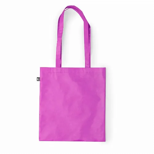 In laminated material of 100 g/m2 with mat finishing, long handles and reinforced stitching. Resistance up to 5 kg weight. Available in a wide range of colors, with RPET distinctive label