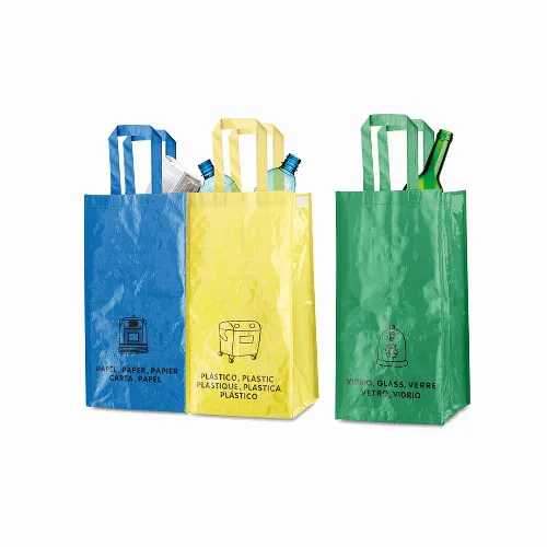 Set of 3 yellow-green-blue recycling bags in resistant laminated pp-woven in 125g/m2 glossy finish.