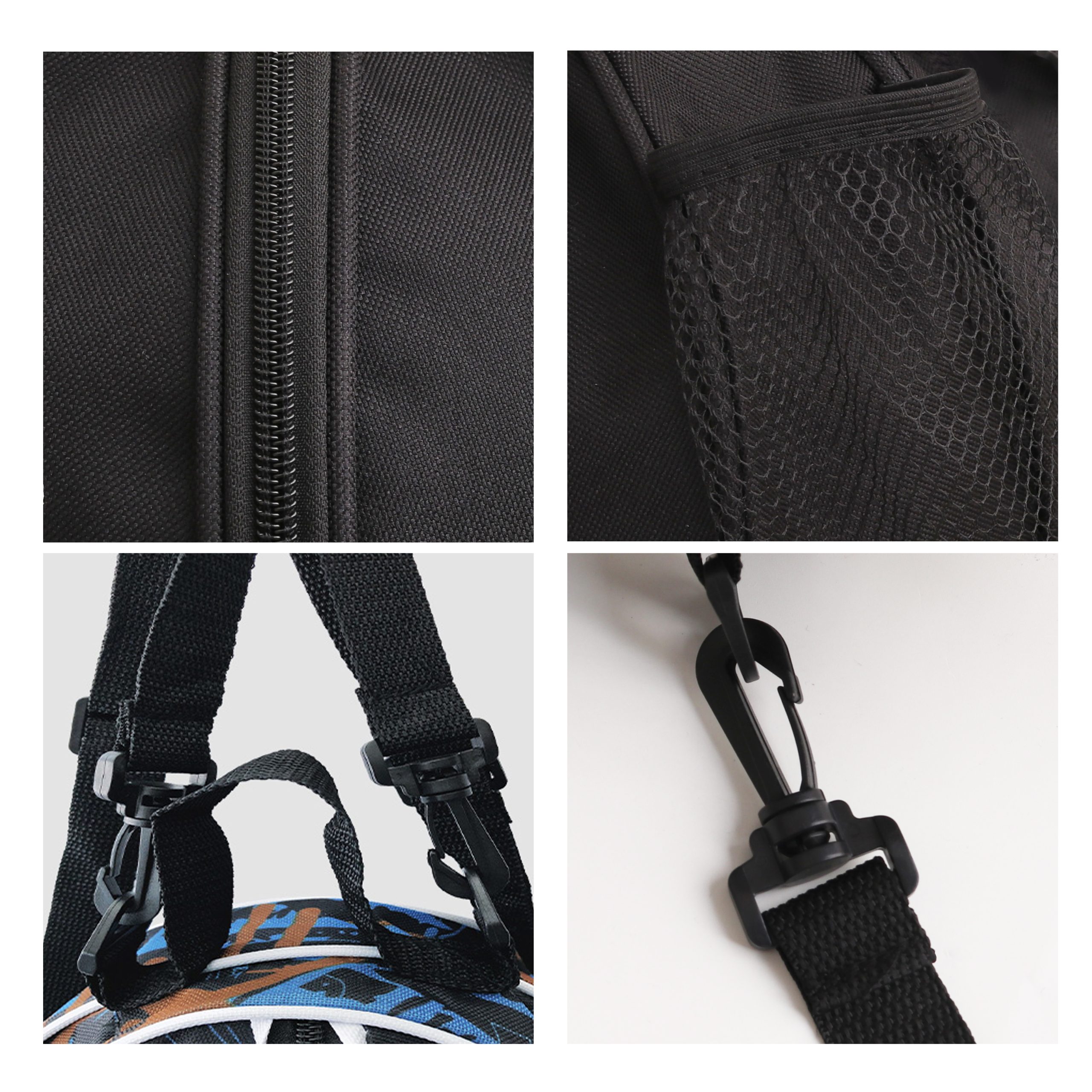Transport your sports balls with ease, with our new ball backpack! This backpack holds one standard size No.7 basketball or other sport balls such as soccer balls, volleyball balls, footballs, rugby balls, netballs, with circumference of 27.5 cm or less. Complete with two side mesh pockets with elastic beam ports for water bottles, snacks, towels, sports shoes, etc. Suitable for all kinds of people, with sturdy shoulder strap buckle design, detachable shoulder strap, adjustable length. Perfect for travelling light with your sports ball and other accessories.