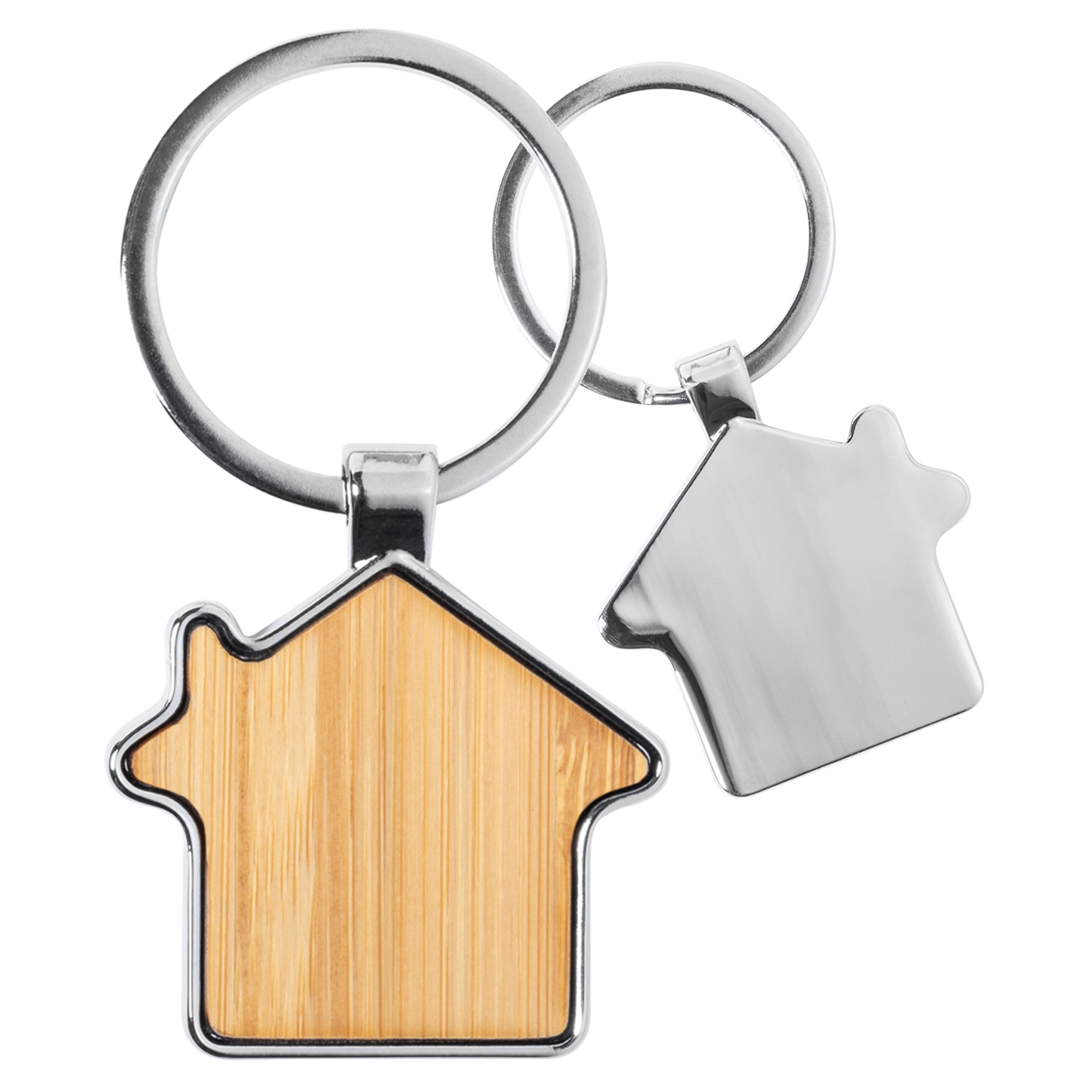 Natural bamboo house shaped key ring cased in zinc alloy metal. Packed into a black cardboard gift box.