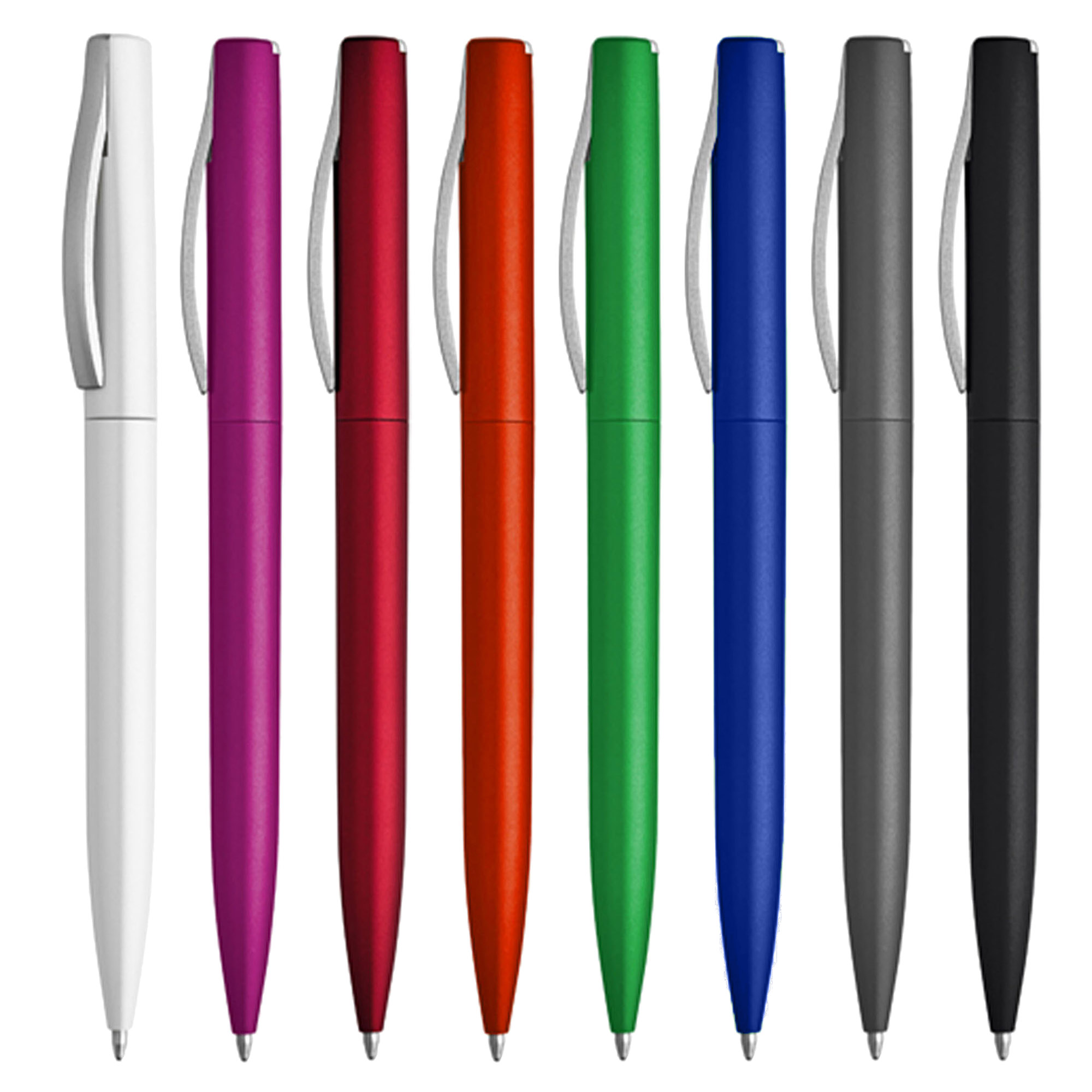 Metallic colour plastic pen with slim curved matt silver clip twist action with a high quality German manufactured black ink refill 1200 meters writing distance tungsten carbide ball which brings you the better writing quality.