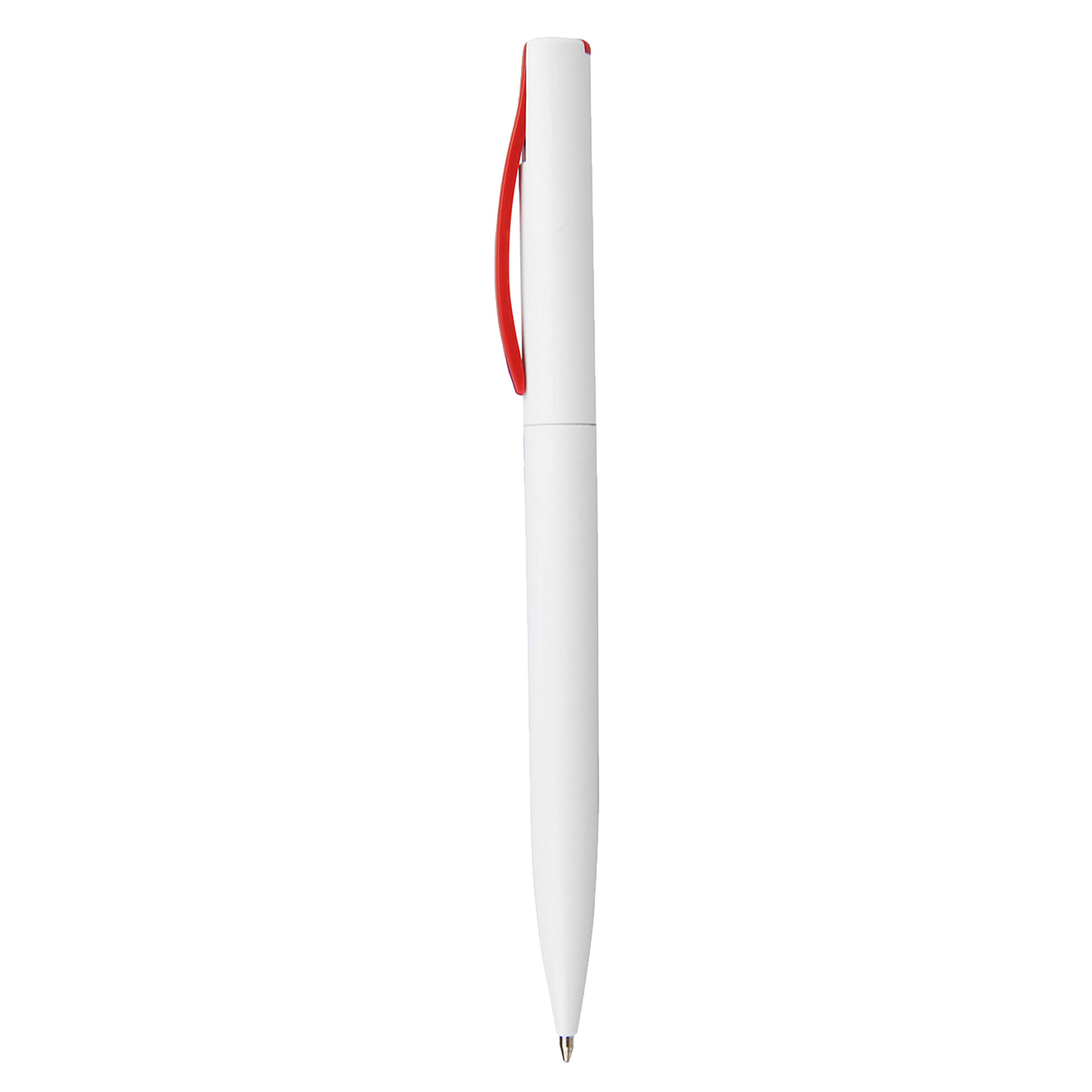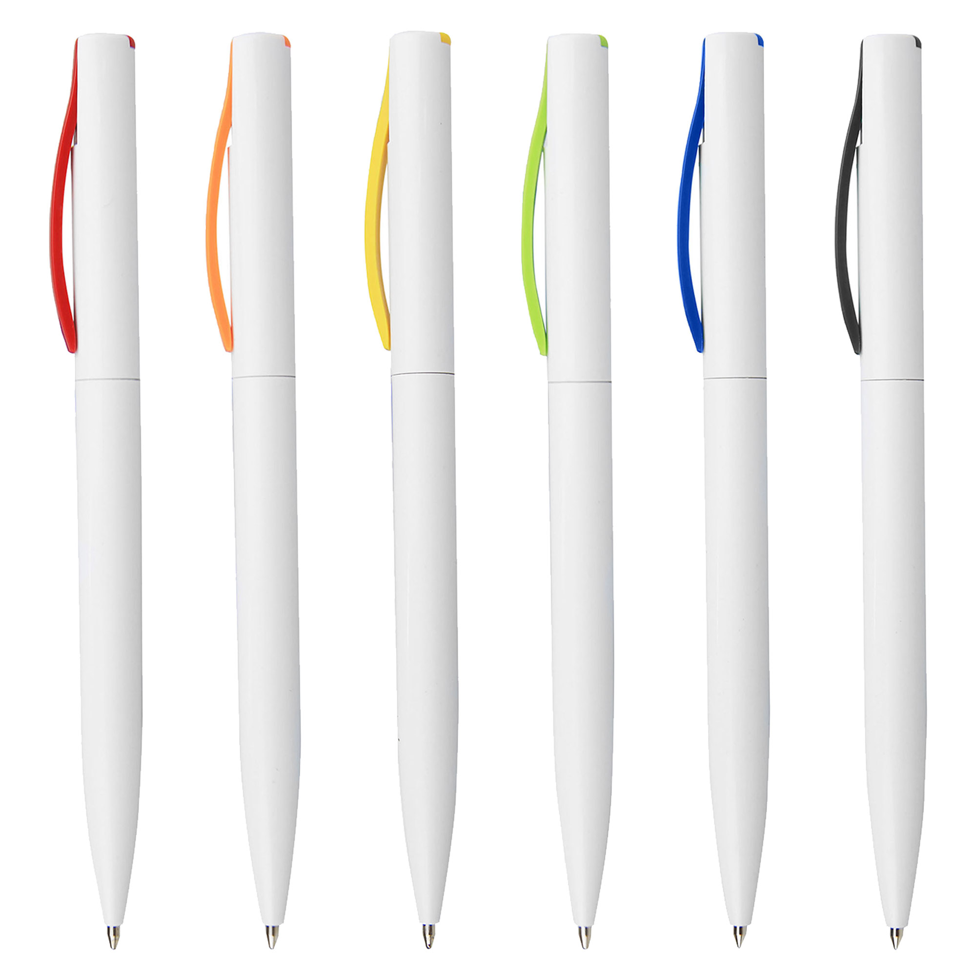 Solid white plastic barrel with coloured slim curved clip twist action with a high quality German manufactured black ink refill 1200 meters writing distance tungsten carbide ball which brings you the better writing quality.