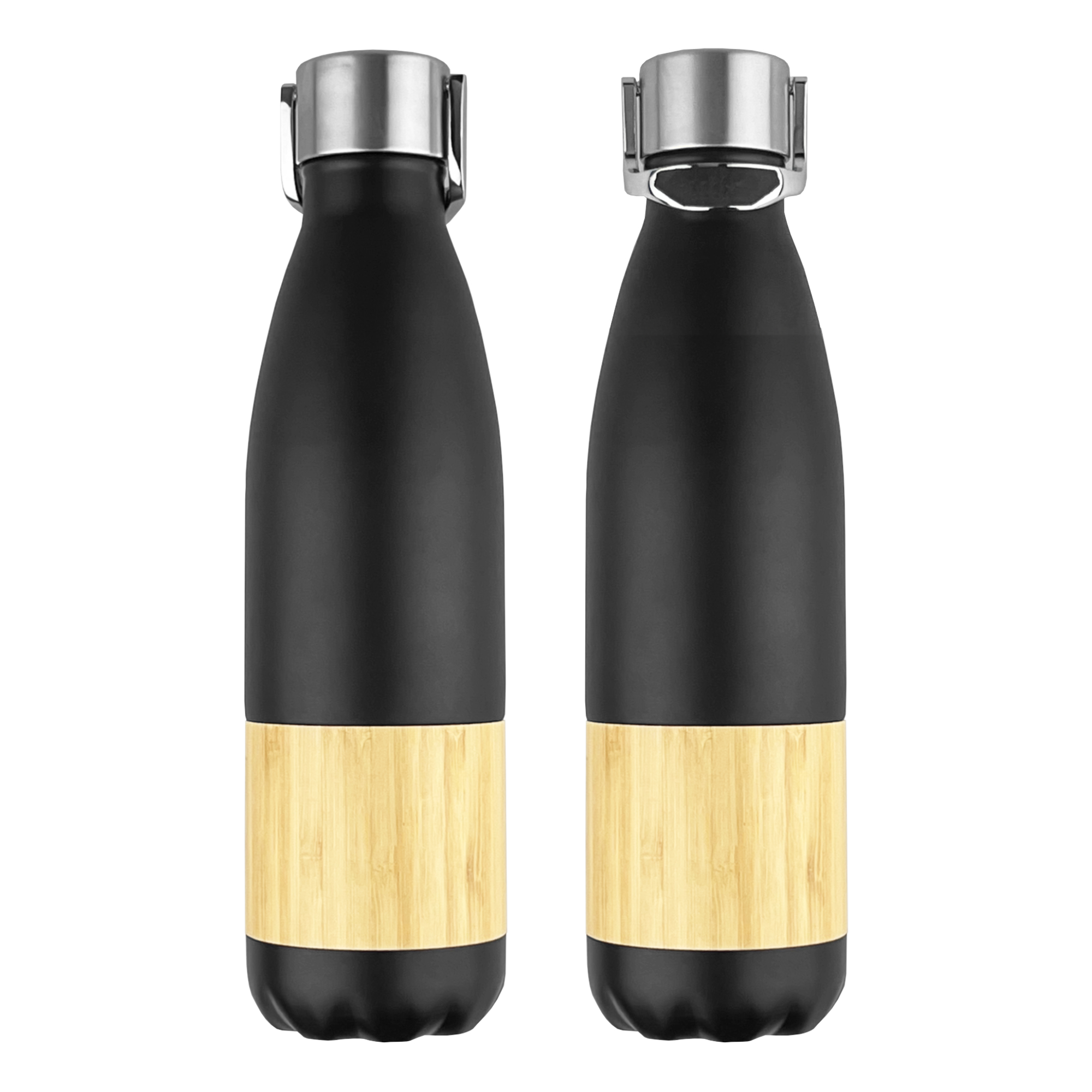 Elegant slim 450ml vacuum insulated double wall 304 stainless steel drink bottle. Featuring an eco-friendly sustainably sourced natural bamboo outer panel which can be engraved and powder coated matt finish in black or white. Screw on metal lid with a silicone panel in black or white on the handle. BPA free. Hand wash only do not microwave.