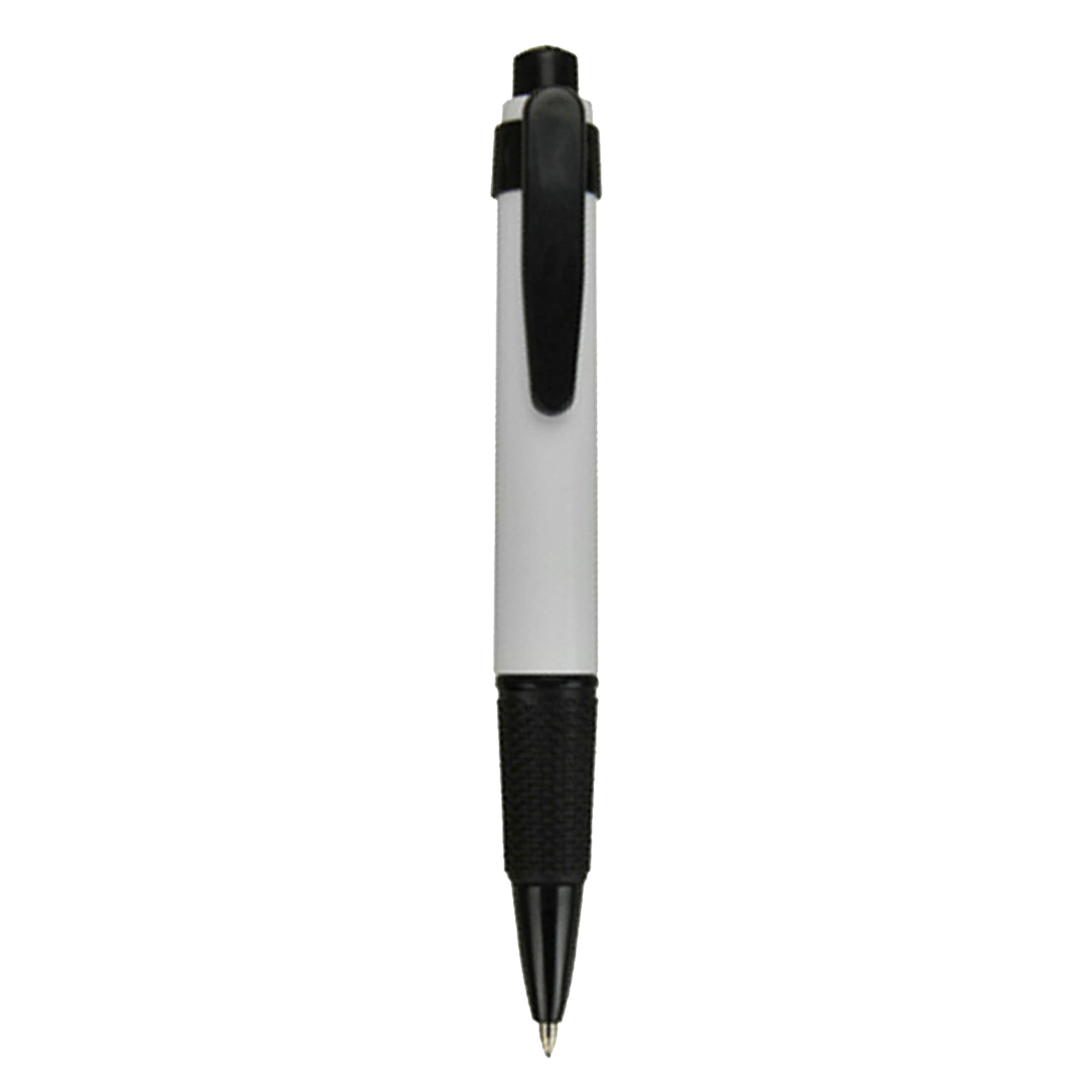 Click action plastic pen opaque white body with coloured rubber grip and plastic matching coloured fittings high quality German manufactured black ink refill 1800 meters writing distance tungsten carbide ball provides you with quality writing.
