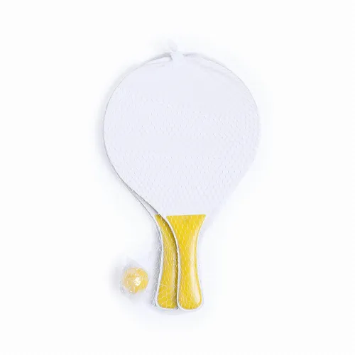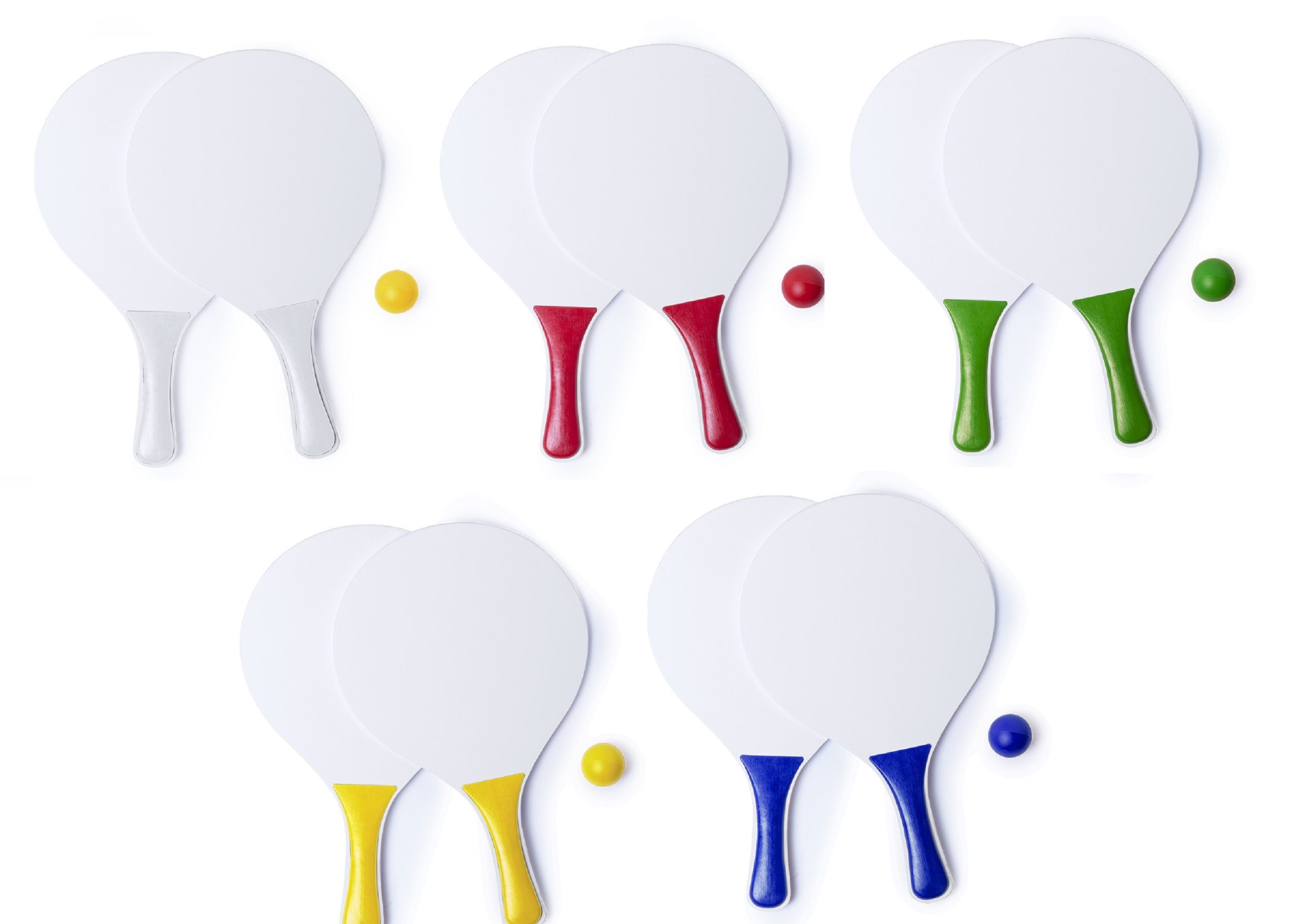 With reinforced handle in varied bright tones. Presented in a mesh bag with matching color ball.