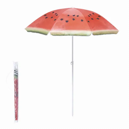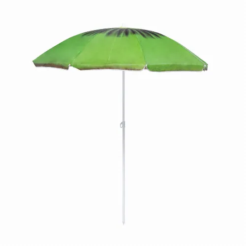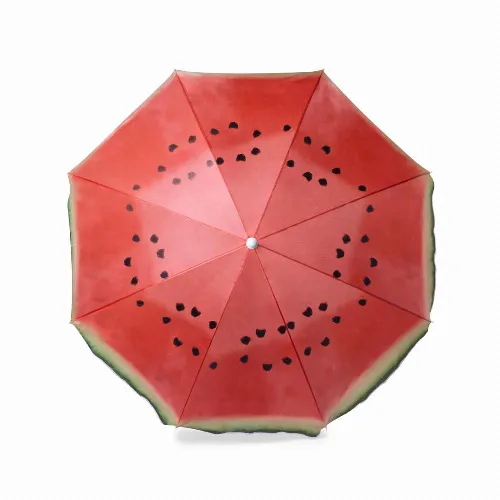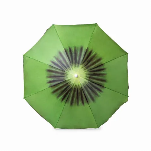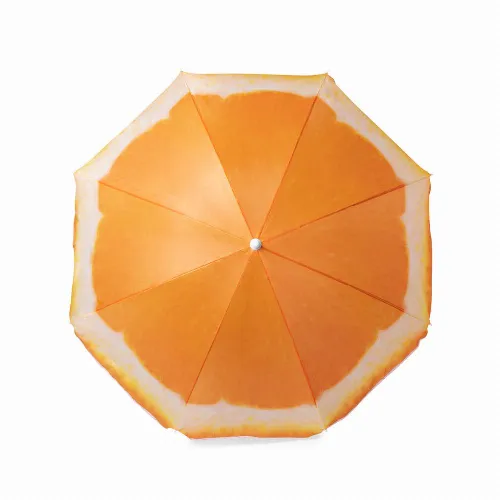 Colourful beach umbrella with fruit designs.