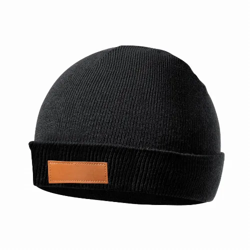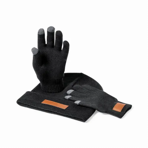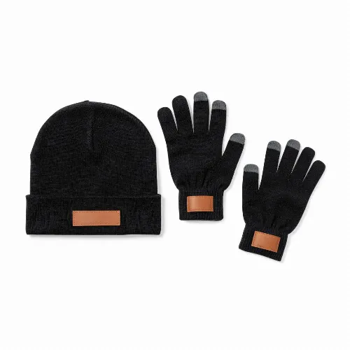 Set of hat and gloves in adult size, made of elastic acrylic material and with a stitched PU patch for branding.
