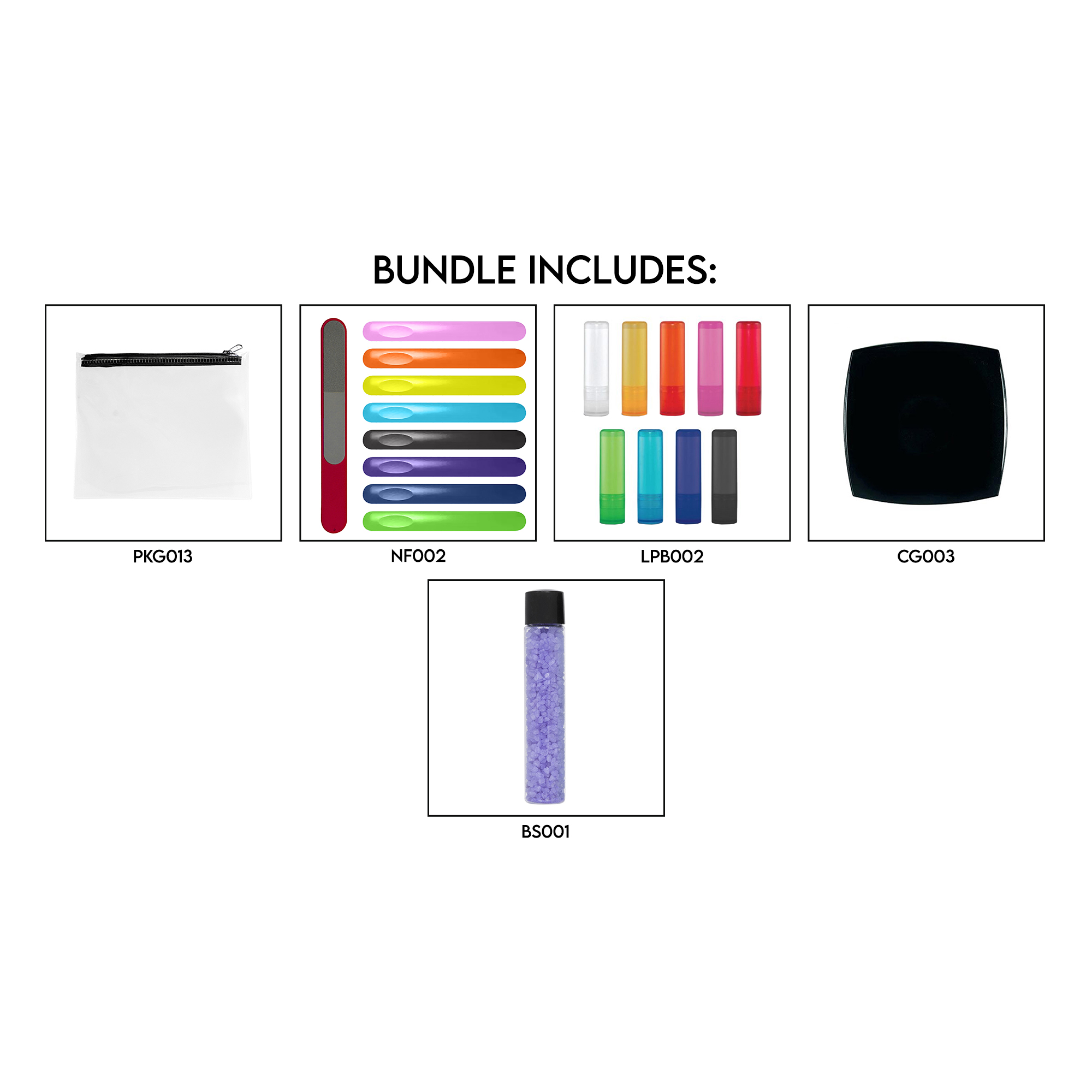 This beauty bundle contains (CG003) Remo company mirror, (NF002) Paris nail file, (LPB002) lip balm stick, and (BS001) bath salt tube, all packed into a (PKG013) Isuki pencil case. Pick and choose your own colour combinations.