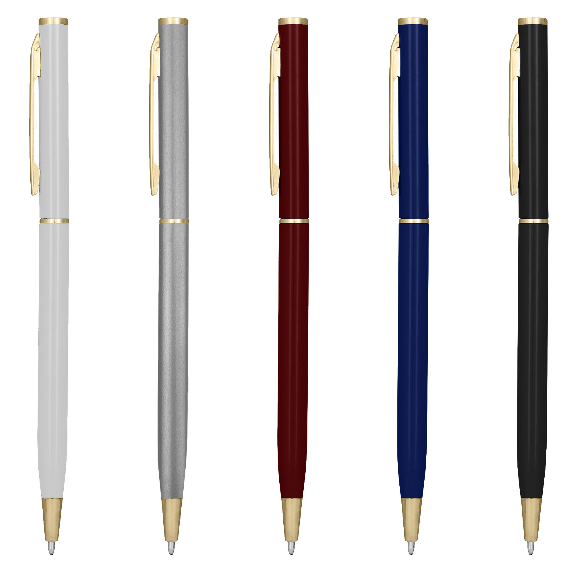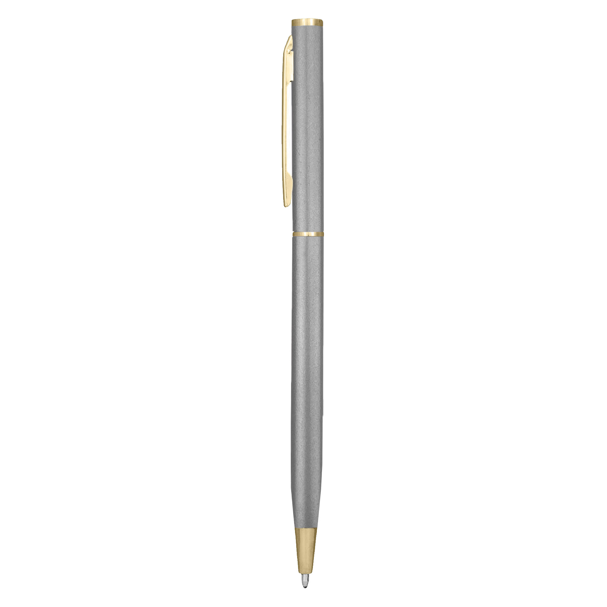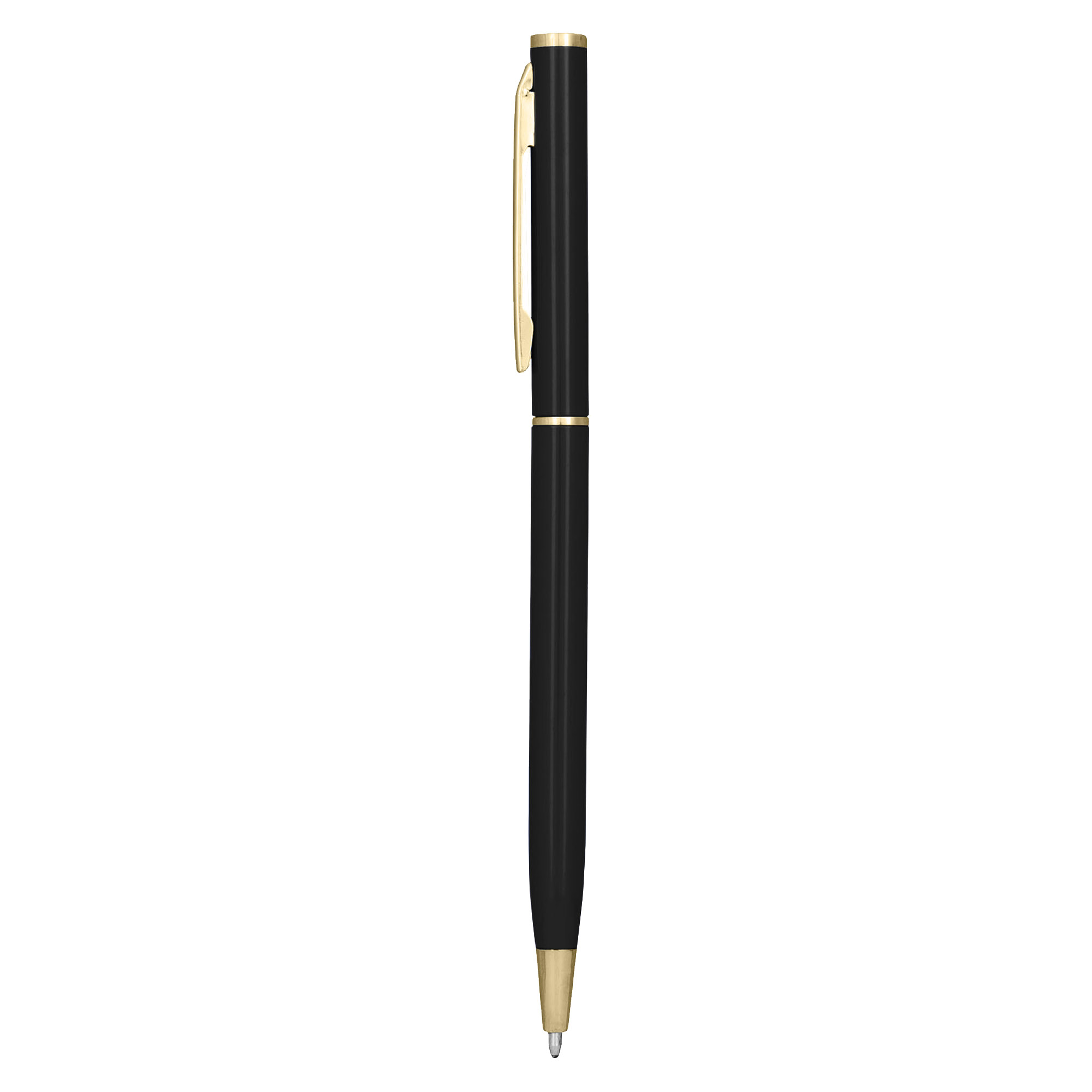 Slim metal hotel pen twist action aluminium barrel with shiny gold trim. A perfect budget metal pen for hotel and motel. It has high quality German manufactured black ink refill 1200 meters writing distance tungsten carbide ball provides you with quality writing.