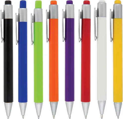 Push button plastic ballpoint pen with a coloured matt finish barrel. The sleek design is complimented by matt silver clip with generous branding area and silver tip. Parker style black refill.