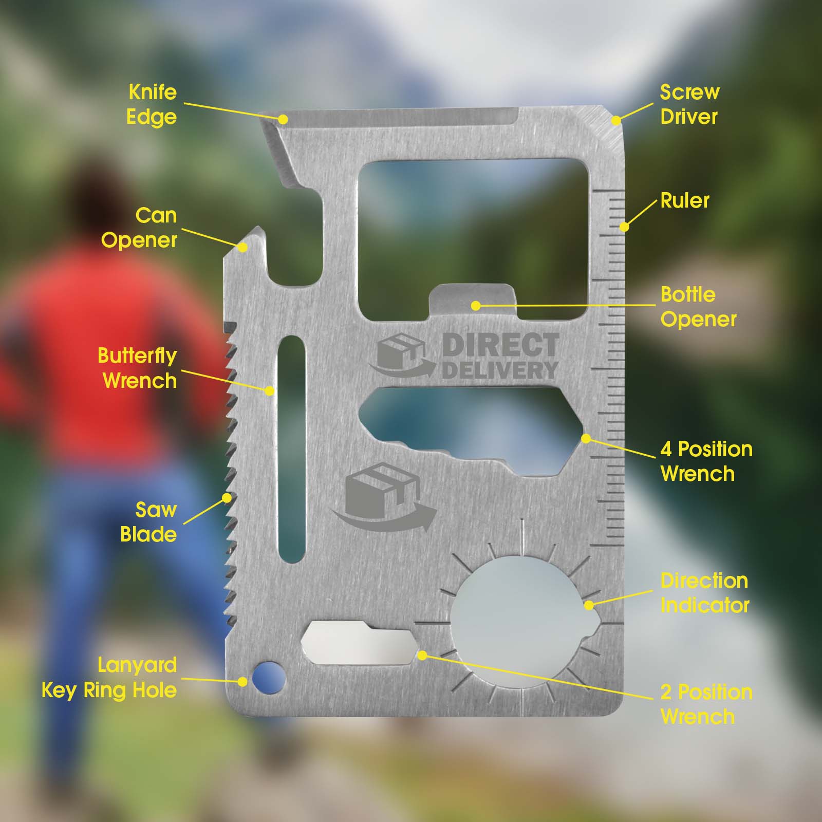 An entire toolbox in your pocket. This credit-card sized multi-tool has 15 tools. The slim form factor features 6 x hex head wrenches, a ruler, can opener, screw driver, knife, a direction indicator, butterfly wrench, saw blade, lanyard hole and of course a bottle opener. Made from heat treated steel. Completely flat 2mm thick. Fits in your wallet.