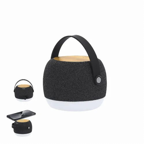 It features an lighting system with 12 LEDs that synchronize with the rhythm of your music, creating vibrant atmospheres. It includes a soft and practical silicone handle for easy transport and RPET logo.RPET material is made from recycled plastic, thus promoting the reuse of plastic waste and helping the sustainability of the planet.Materials such as Bamboo promote the use of natural raw materials, thus reducing pollutant emissions. It comes from a highly resistant and versatile plant, with rapid growth and regeneration, making it an excellent alternative to the use of traditional wood.