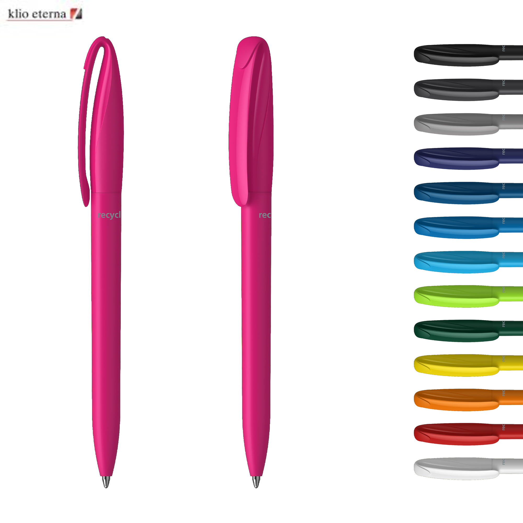 Klio the iconic European brand since 1900 now available worldwide. (Klio Model: 41190) Environmentally conscious twist-action pen crafted from recycled plastic featuring a blend of matte and shiny surfaces for a modern aesthetic. Its large printing area clip allows for brand customization. Equipped with a high-quality silktech German-manufactured black ink refill meeting ISO 12757-2 standards with a shelf life of 3 years it ensures reliable performance. With an impressive 3000 meters writing distance triple that of standard pens and a tungsten carbide ball for smooth writing it’s designed for lasting quality. Made in Germany and exclusive to Dex Collection in Australia and New Zealand. Minimum order of 500 units per colour; custom colours available for orders of 5000+.