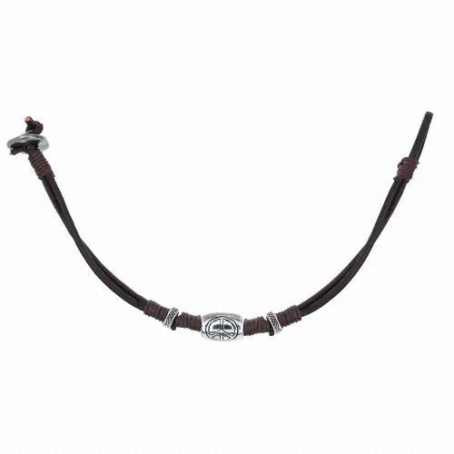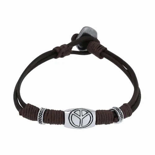 Brown leather bracelet decorated with waxed cotton cords and silver-plated beads, one of them with the peace symbol.