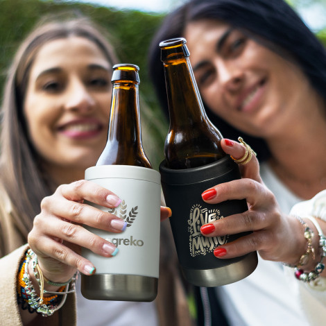 Smart 300ml double wall, vacuum insulated stainless steel stubby cooler with a powder coat finish, that will keep beverages cold for longer. The Brewski Pro has a secure screw on top, a built-in bottle opener, and fits most standard cans and bottles. BPA-free and laser engraves to a shiny steel finish. This product is not dishwasher safe and handwashing is recommended.