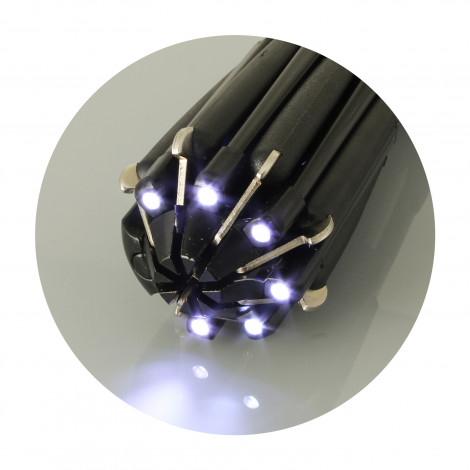 Compact nine-function multi-tool with a clip which has seven tools that flip out of the main housing and lock in place. It contains four Phillips screwdrivers and four conventional screwdrivers. The tool also has a flashlight with six powerful LEDs that use two AAA batteries which are included.