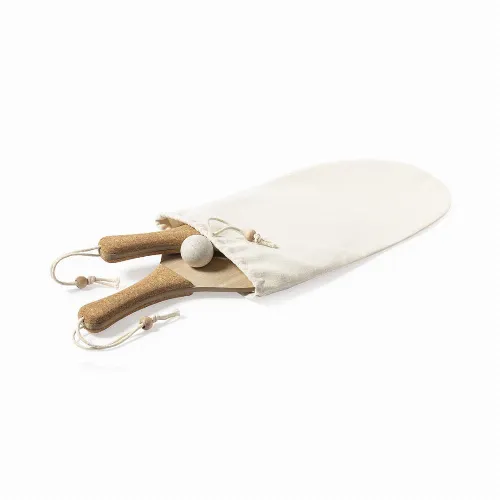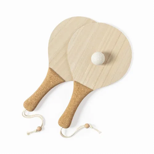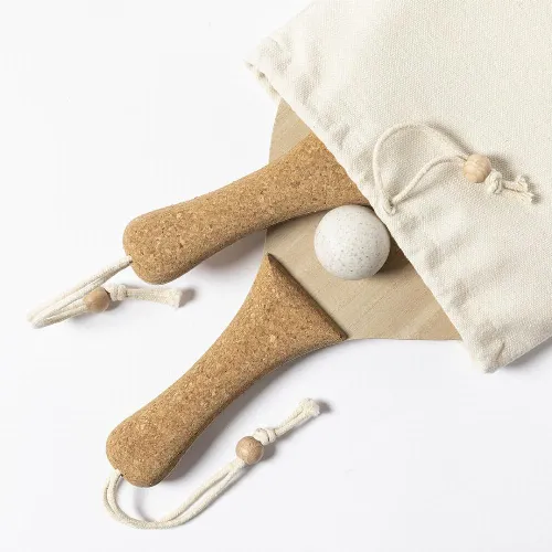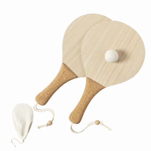 Made of wood, with natural cork reinforced handle and wrist straps with adjuster. Presented in a natural cotton bag with drawstring closure, including wheat straw ball.