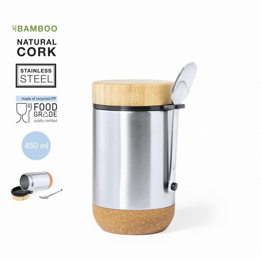 Double wall stainless steel body, with cork base to maintain the temperature and safety cap in bamboo, including attachment accessory for the stainless steel spoon (included). Presented in an individual box of eco design in kraft cardboard.