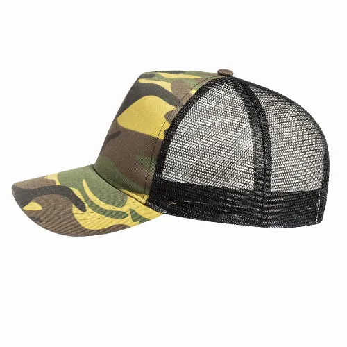 RPET polyester 5 panel cap with mesh and adjustable plastic fastening.