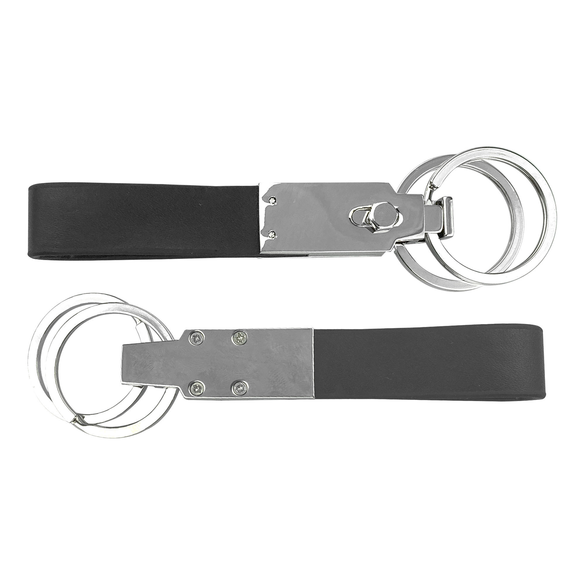 Leather key ring with 2 rings one ring can be released by pushing the button when the key ring is on your belt can be laser engraved and printed print may fade over time.