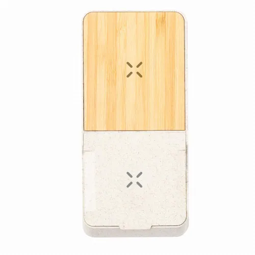 Complete 15W wireless charger with holder, made in a combination of bamboo and wheat straw.