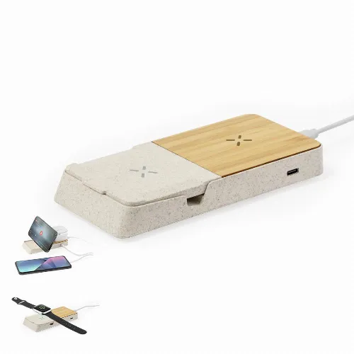 Designed for simultaneous charging of smartphone, smartwatch, and earphones, both wirelessly and using its Type C port. An all-in-one, versatile charging station with smartphone or tablet holder. Presented in an attractive individual kraft box and with instruction manual in English and Spanish available.Wheat straw promotes the use of natural raw materials, thus reducing pollutant emissions.Materials such as bamboo encourage the use of natural raw materials, reducing pollutant emissions. It comes from a highly resistant and versatile plant with rapid growth and regeneration, making of it an excellent alternative to traditional wood.Manufactured according to RoHS standards and in compliance with the following safety requirements: Overheating protection system. Over-charge protection system. Blocking system to prevent short circuits.
