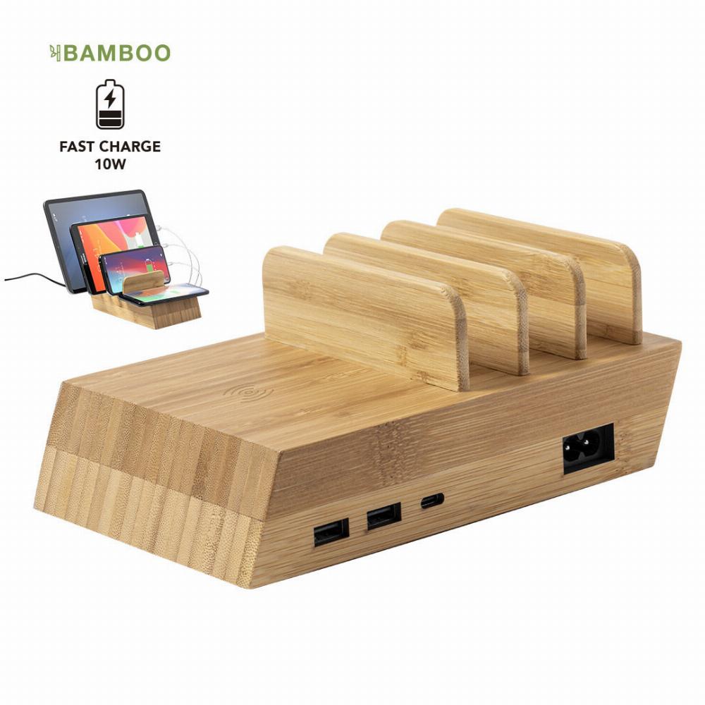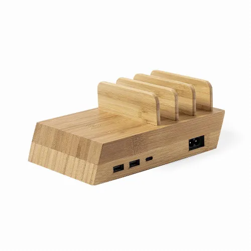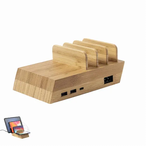 Made of bambo and including 2 USB and 1 Type-C outputs. Compatible with devices equipped with wireless charging technology. 150 cm connection cable, with European plug and a wide branding surface. Presented in an attractive eco-design box, with instruction manual available in English and Spanish.Compliant with safety requirements: Overheating protection system.Overcharge protection system.Blocking system to prevent short circuits.