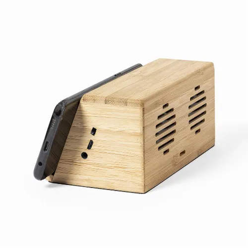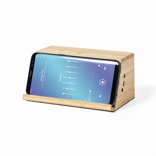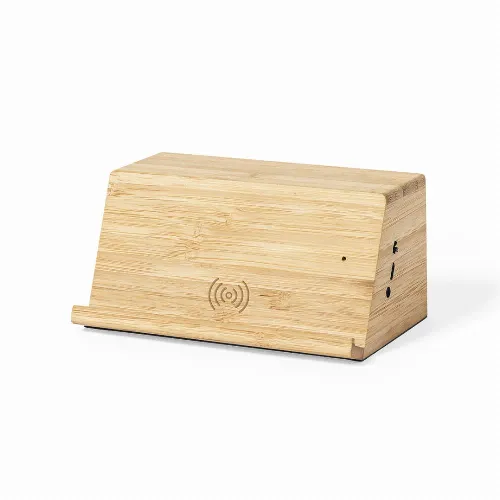 Integrated smartphone holder and 2 speakers of 3W each. Made of bamboo from natural cuttings, with non-slip base. Compatible with devices equipped with wireless charging technology and rechargeable via USB cable -included-. Large branding surface and presented in an attractive eco-design box.