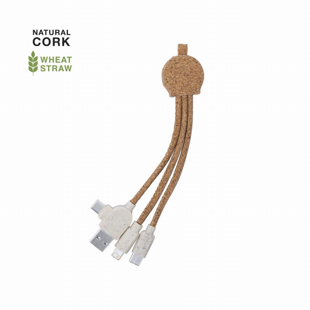 Nature line USB charger cable, made of natural cork and with accessories in wheat straw, promoting the use of natural raw materials and reducing pollutant emissions.