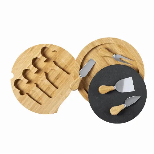 Cutting and presentation board made of slate, removable for easy cleaning. Stainless steel utensils and bamboo handle. Presented in an individual, bamboo die-cut case and attractive eco-design individual box.