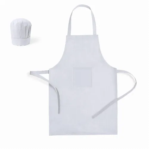 Children´s set of apron and kitchen hat in brightly colored non-woven.
