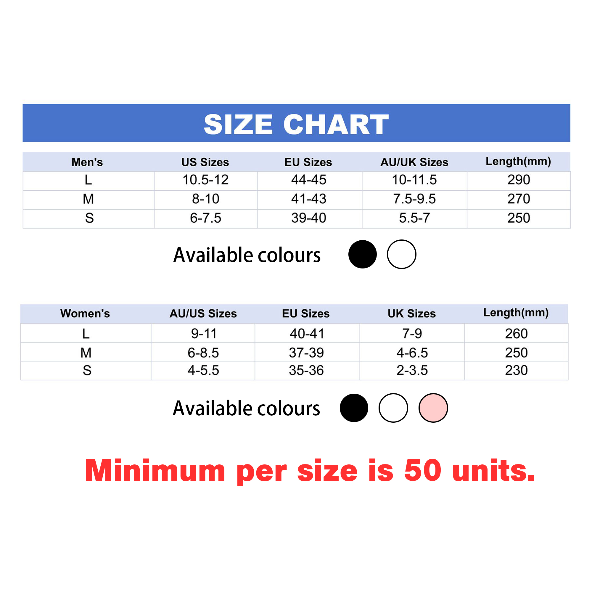 Please note, price is per pair. Minimum quantity for one size is 500 pairs.