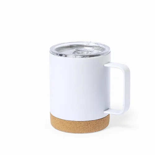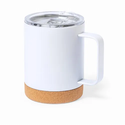 With dispenser in lid, BPA free, and natural cork base. It is ideal for your desk, table, or any surface where you can enjoy your favorite drink.